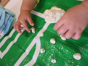 それぞれの遊び方で感触遊びに挑戦していた0歳児さんです![]()