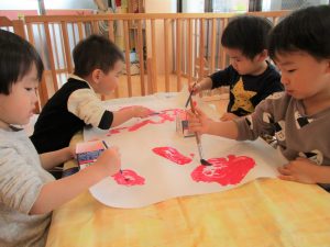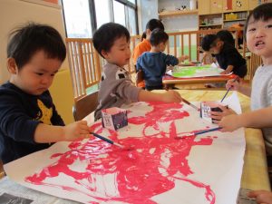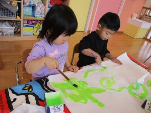筆の使い方にも慣れてきた2歳児さんと、まだ経験の少ない1歳児さんと一緒に、大きな紙に色を塗って楽しみました![]()