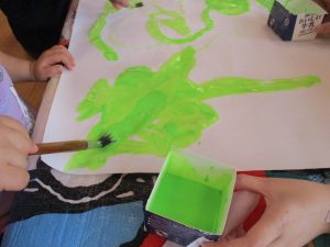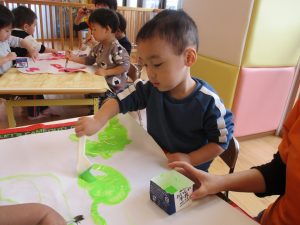 ピンクと緑、好きな色を選んで思い思いに絵の具を広げていきます![]()