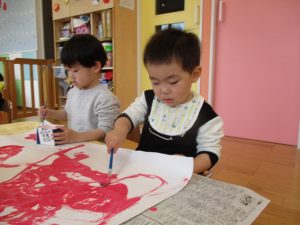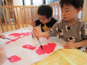 1歳児さんも2歳児さんの真似をして上手に筆で色を広げていきます![]()