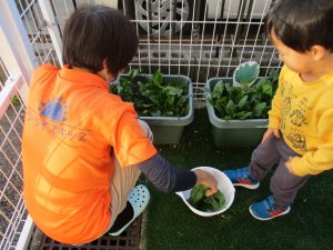 こんにちはサンライズキッズ今伊勢園です 園庭で育てているほうれん草がどんどん葉っぱを増...