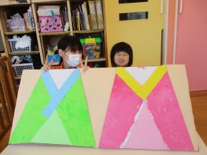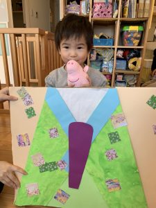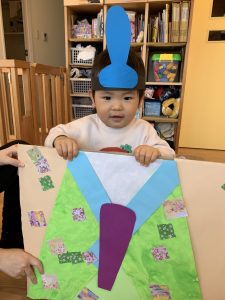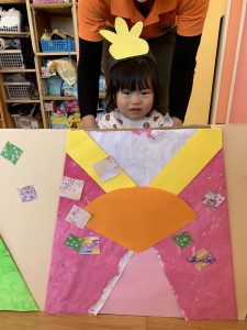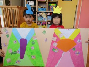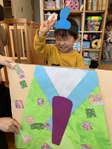 次に、0歳児さん、1歳児さんに着物を飾ってもらいました![]()