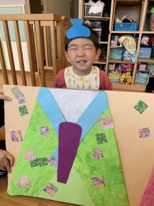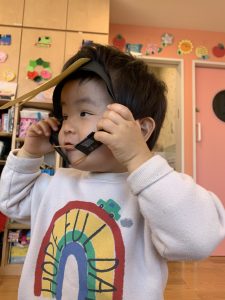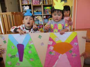 2歳児さんには、お雛様とお内裏様に欠かせない扇子、笏(しゃく)、冠、烏帽子をつけてもらいました![]()