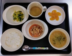 ご飯 味噌汁 チキンケチャップ ごま酢和え(きゅうり) みかん缶