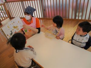 公園でどんぐりを発見して、お友だちと楽しい時間を過ごすころわんのお話に釘付けでしたよ![]()