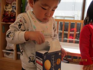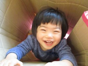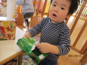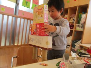 お菓子の箱に夢中な子どもたち