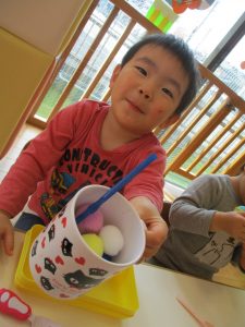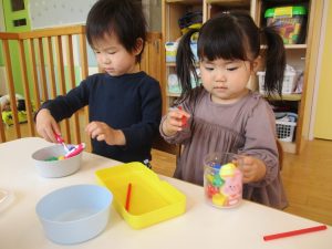 シール貼りやスプーンを使った指先遊び、おままごとなども楽しみました![]()