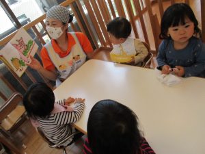 プーちゃんが口ずさむ歌を楽しそうに身体を揺らしながらリズムに乗る子どもたちです