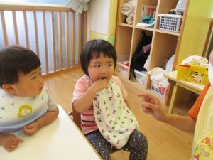 保育士が「はいしゃのせんせいがきたら、どうやってみてもらう?」などと声を掛けると、大きな口を開けて見せてくれる子どもたちでした