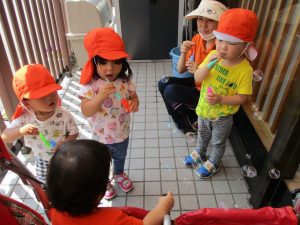 今週は天気の崩れる日もありましたが、天気のいい日にはエントランスに出たり保育園の回りで散策をしたりして過ごし、雨天時には室内でゆったりと過ごしました