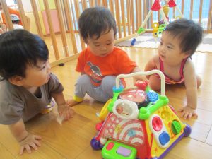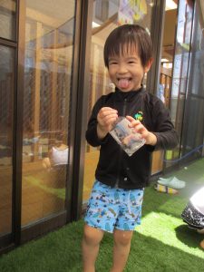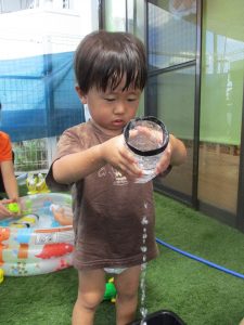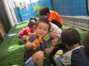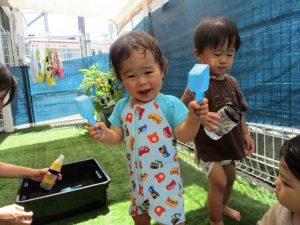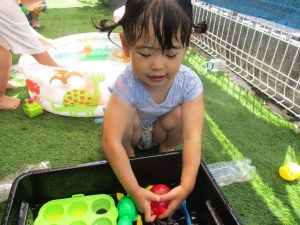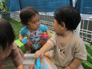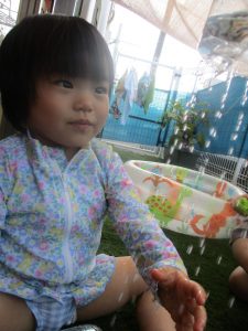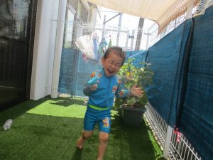 中には、体調不良で水遊びをしばらくお休みしていた子もおり、みんなで一緒にする水遊びに大喜びでした