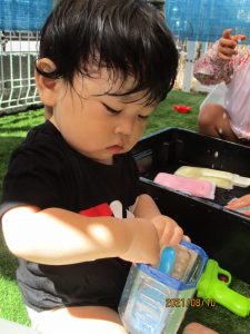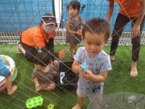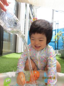 室内でしっかり身体を動かした後は、園庭で水遊び![]()