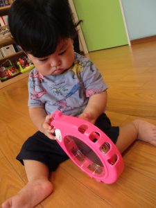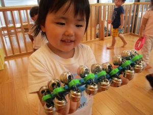 鈴やタンブリンを使って音楽に合わせてリズムに乗ります
