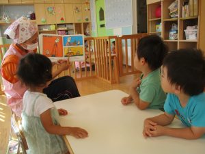 毎日行っている絵本の読み聞かせですが、その年齢に合った内容のものや季節感を感じられるもの、またそれぞれのクラスが興味や関心を持っていることなどを考えて絵本選びをしています