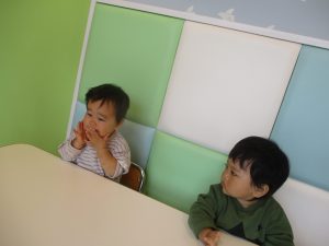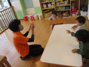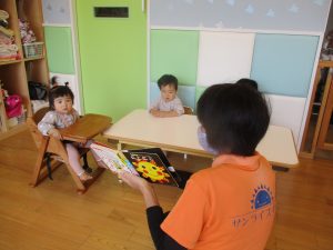 椅子に座って読み聞かせをみたり、手遊びや歌を一緒に楽しんだりすることができるようになってきたもも組さん?