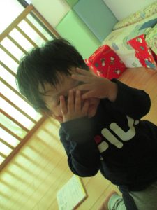 小さな手で顔を隠しますが隠しきれず間から目が合うと、急いでまた顔を隠し直していました(笑)