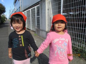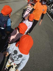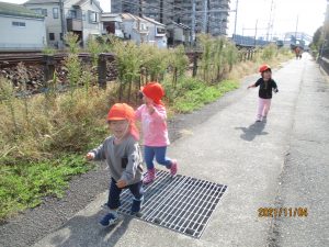いちご組さんは仲よく線路沿いに散歩へ出かけます