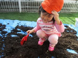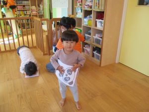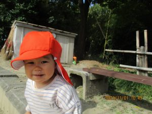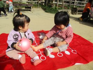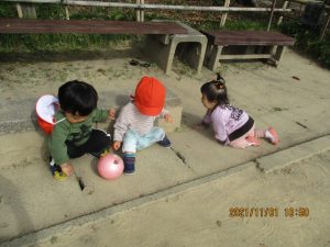 広場では散策をしたりボールやフラフープなどの道具を使って遊んだりして、汗ばむほど戸外遊びを楽しんでいました