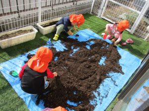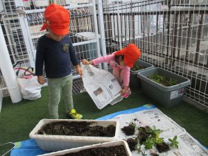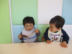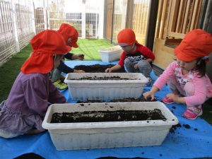 保育士の声かけの元、せっせと手を動かすりんご組さん