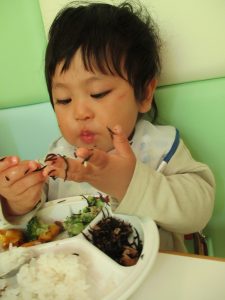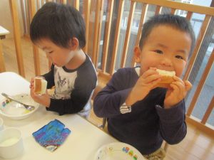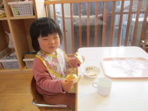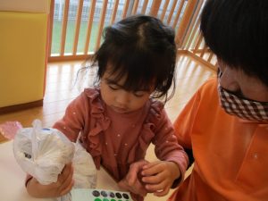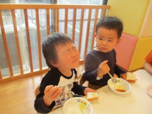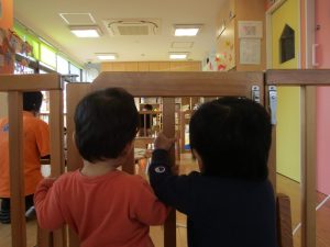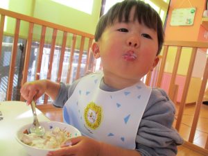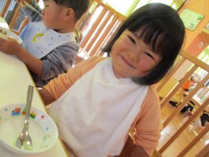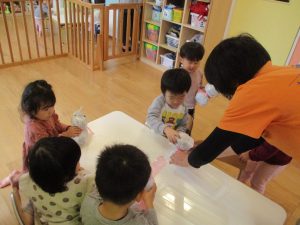 年上児さんが率先して小さな友だちのお世話をしてくれるので、もも組さんもお兄さんやお姉さんが大好きです![]()