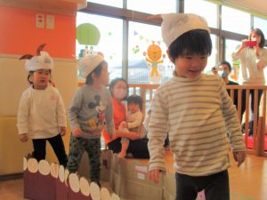 はじめはどんな風に言葉を発し、動いたらいいのか戸惑う様子も見られましたが後半は役になりきってセリフを言ったり歌を歌ったりする姿が見られるようになりましたよ![]()