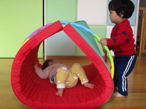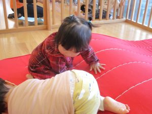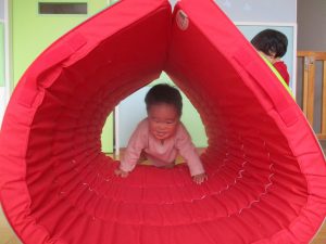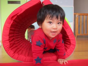 マットで作った山を登り降りしたりトンネルをくぐったりと、元気いっぱい身体を動かして遊ぶもも組さん?✨
