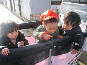 もも組さんは散歩車に乗って雪を見に行きましたよ![]()