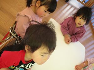 実際に目の前で物を隠したり人形たちがかくれんぼのやりとりを楽しむ様子を見せたりすることで、かくれんぼという一つの遊びに関心を示している子もたくさんいます