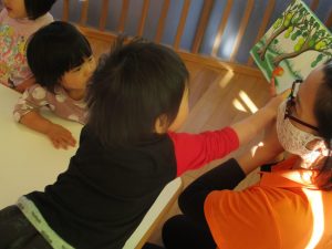 子どもたちは、うずらちゃんとひよこちゃんのかくれんぼのやりとりに夢中です