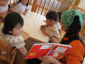 お兄さんやお姉さんたちと同じようにもも組の小さなお友だちもとっても集中して絵本を見ていました