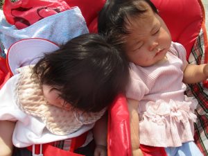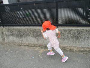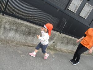 散歩車ではなく、保育士と手を繋いで歩いてお散歩へ![]()