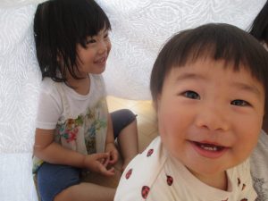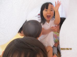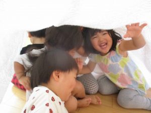 大きなシーツでかくれんぼを楽しむ子どもたち![]()