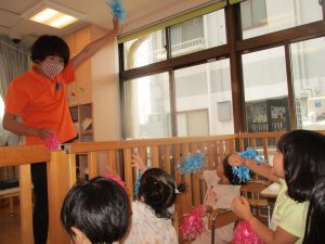 と保育士の号令に合わせて、ポンポンをあげますヽ(´▽`)/