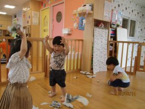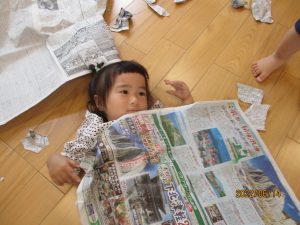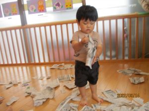 別の日は新聞紙遊び?