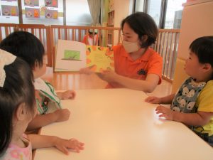 お話は、保育園の先生がカエルを見つけ、飼うところからスタートします![]()