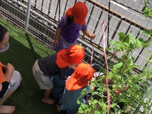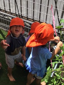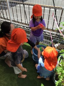 バケツに入れた水を、可愛い手でトマト?やきゅうり?に運ぶ姿も?