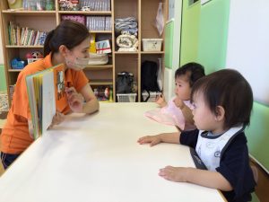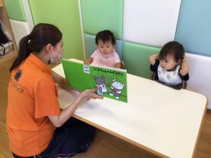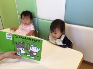 今回ご紹介する「こぐまちゃんのみずあそび」を保育士に読んでもらっていますよ?
