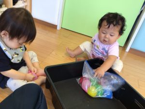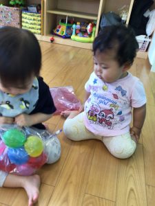 室内で水風船をジップロック越しに触ったり、色水が入った袋に興味を持ったりしていましたよ![]()