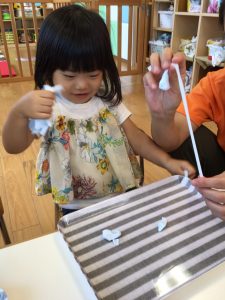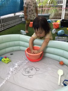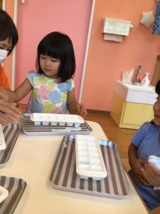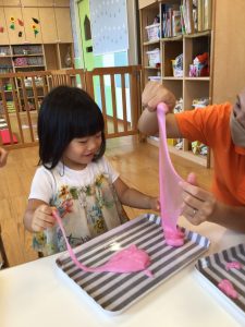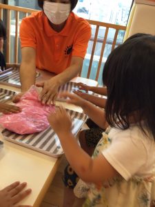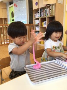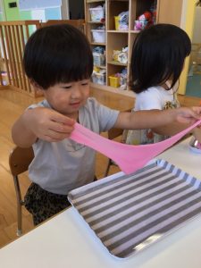 暑い日には冷たいジュースやアイスもいいものですが、保育園ではひんやり冷やしたスライムで楽しく遊んで涼みましたよ✨