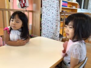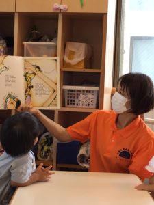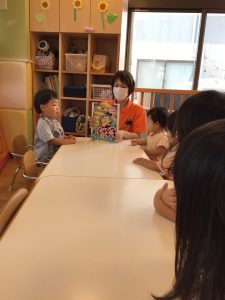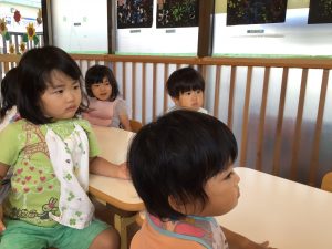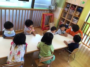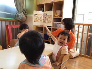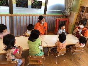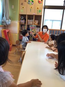 7月から来た新しい保育士の読み聞かせや絵本前の手袋シアターも、楽しくて集中して見ている子どもたちです![]()