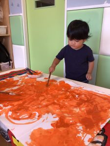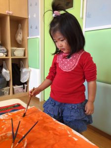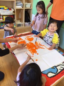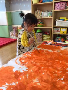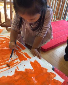 手や筆を使ってオレンジ色に染めていきます
