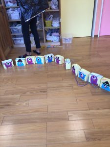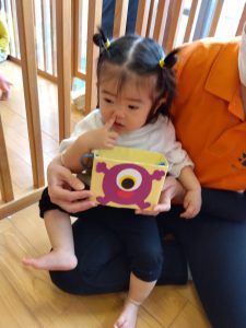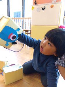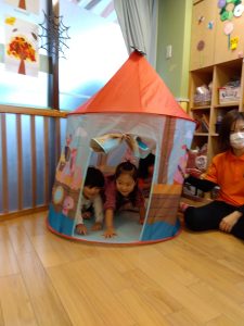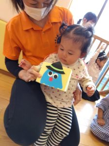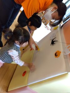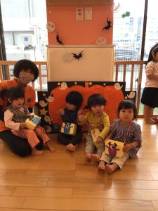 ハロウィン会までに、ハロウィンにちなんだ絵本を読んだり、「トリックオアトリート」と言う練習もしたりしました