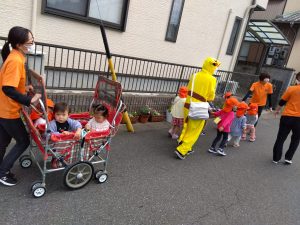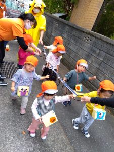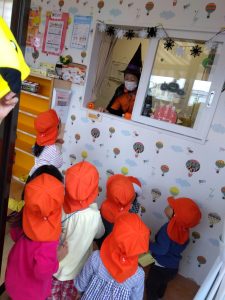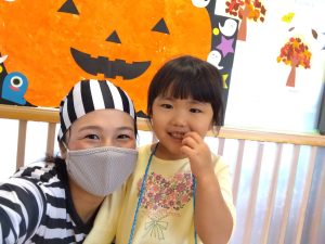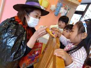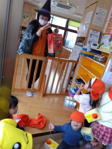 仮装した園長先生に、ちょっぴりドキドキしながら「トリックオアトリート」と言って、練習の成果を出し切ることができましたよ