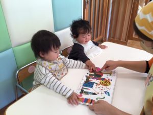 絵本の中からきんぎょを探そうと集中してみていますね