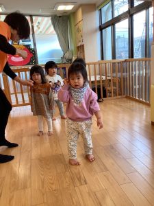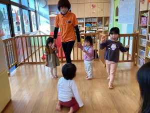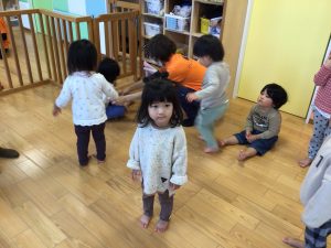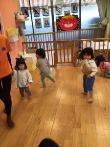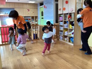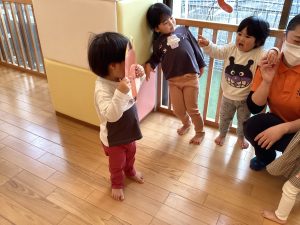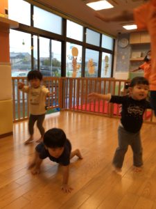 また歌に合わせて集団で遊びの「むっくりくまさん」や「おおかみさん」も大好きですよ![]()