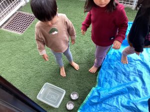 今週は気温が下がると予想して園庭にカップやバケツに水を入れて置いておきました![]()