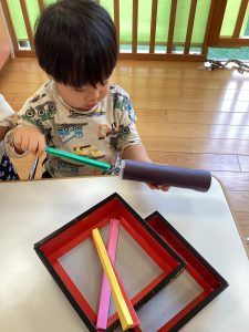 自分で作ったマスに豆をいれて、