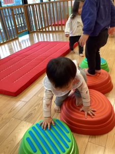 体操のカリキュラムでは、巧技台やボールなどを使ってバランス感覚を養ったり身体を使った遊びの中で様々な動きを楽しんでいます🏃‍♂️