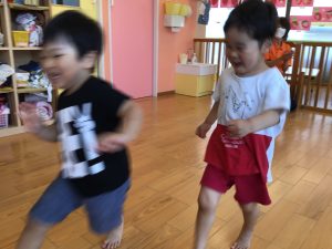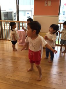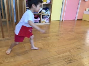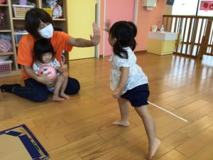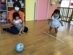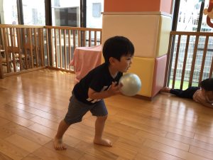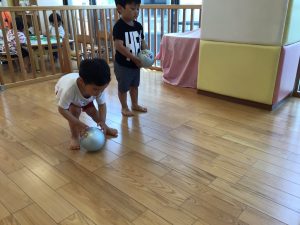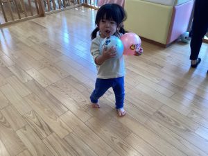 今月はボールを使った遊び、「よーいどん」の合図で走る、ジャンプ、を取り入れています