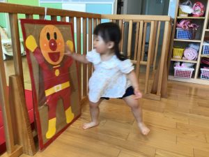 ボールを使った遊びでは、バイキンマンのパネルをめがけてボールを転がしバイキンマンを倒す、という遊びをしています